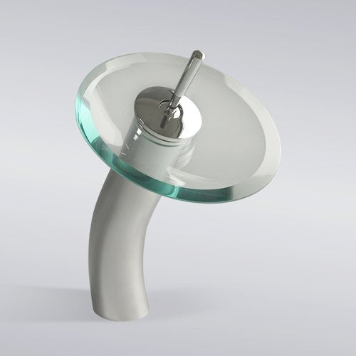 Brand new Euro modern contemporary brushed nickel waterfall faucet vessel filler. The water flows off the glass tray like a waterfall. Premium quality.