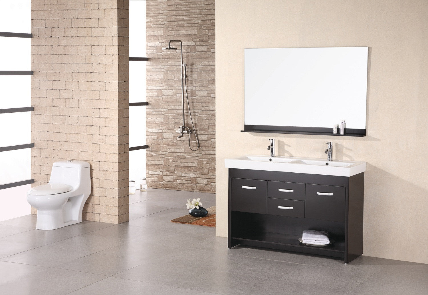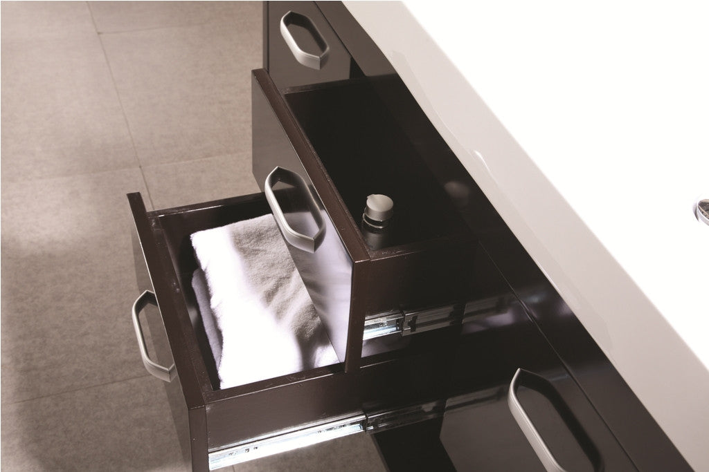 The 48" Citrus Vanity is uniquely designed and constructed of solid oak wood. The mini double sink vanity equipped with an integrated porcelain drop in sink. The robust edge brings a crisp clean contemporary look to any bathroom. The rectangular double sinks unique rolling curved basin, beautifully contrast with the sharp lines of the espresso cabinetry. This sophisticated vanity includes four drawers with satin nickel finish hardware, and a large open storage shelf at the bottom. A large mirror with an espresso shelf is included. The Citrus vanity is designed as a center piece to awe-inspire the eye without sacrificing quality, functionality or durability.