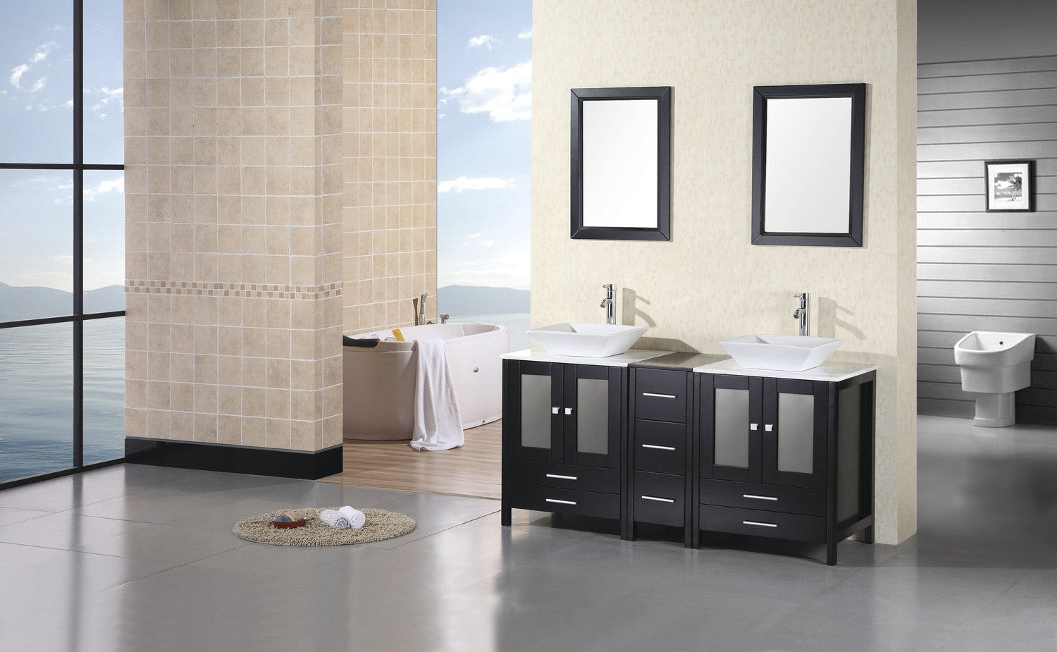 The Arlington 61" Double Vanity is elegantly constructed of solid oak wood. The designer vessel sink and Carrera White Marble counter top bring a crisp contemporary look to any bathroom. The rectangular porcelain sink and marble counter top beautifully contrast with the rich features of the espresso cabinetry. This stylish design includes a soft closing double door cabinet and two drawers. A matching detached espresso cabinet with three drawers is provided for additional storage. Included with this set is an espresso framed mirror. The Arlington bathroom vanity is designed as a center piece to awe-inspire the eye without sacrificing quality, functionality or durability.
