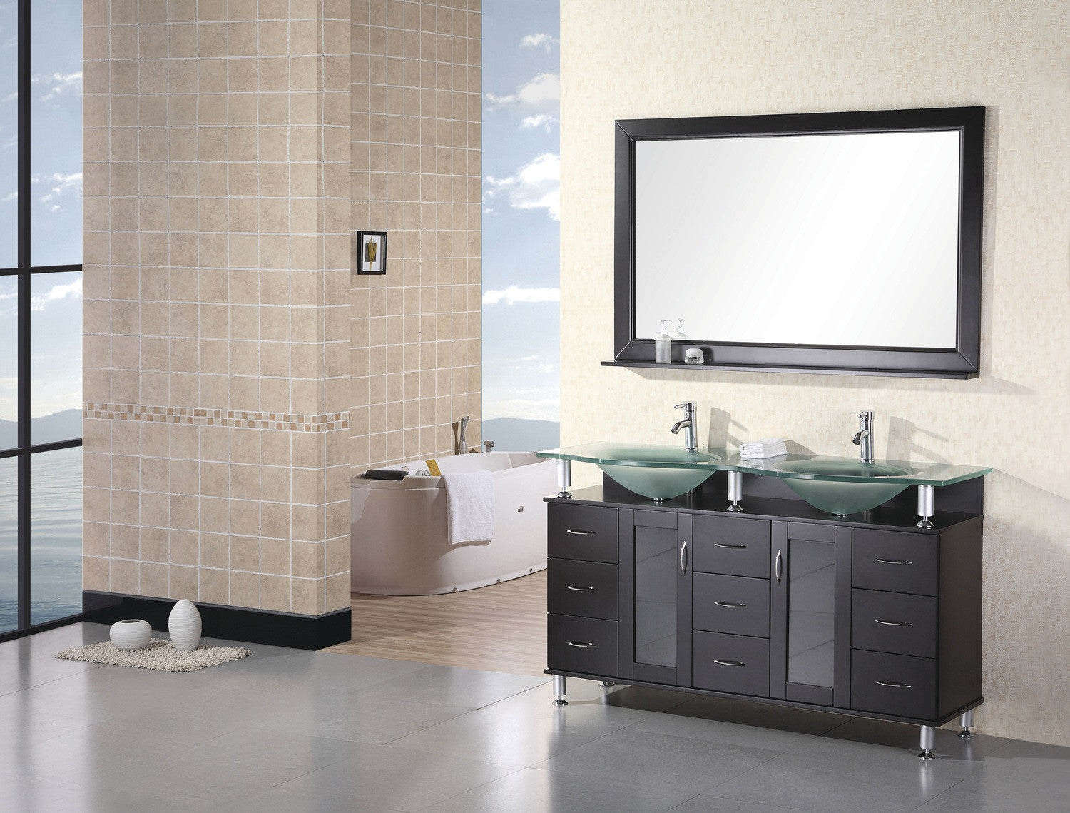 The Huntington 61" Vanity Set is elegantly constructed of solid oak wood. The integrated tempered glass counter top and flowing curved design bring contemporary elegance to any bathroom. The seamless oval drop in sinks beautifully showcases the frosted counter top. This unique design includes two soft closing cabinets with nine drawers all adorned with chrome finish hardware. Included is a large espresso framed mirror with shelf. The Huntington bathroom vanity is designed as center piece to awe-inspire the eye without sacrificing quality, functionality or durability.