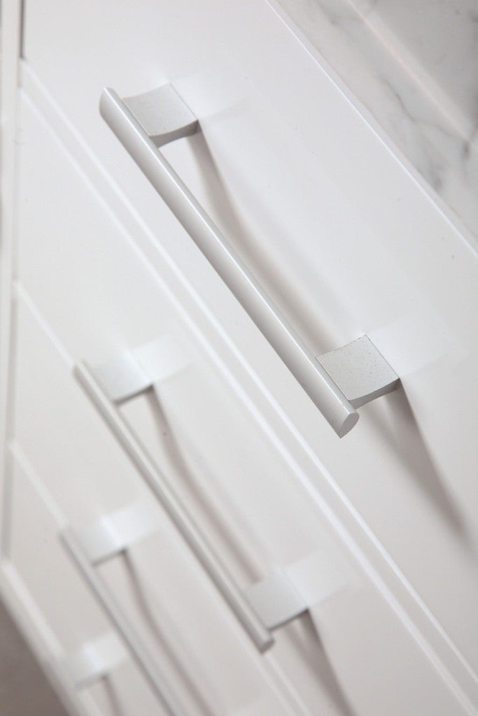The London 48” Vanity is elegantly constructed of solid oak wood. The white Carrara Marble counter tops classic beauty and contemporary styled cabinetry bring a sophisticated and clean look to any bathroom Seated at the base of the ceramic sink is a chrome finished pop up drain designed for easy one touch draining. A large pearl white framed mirror is included. This beautiful vanity has ample storage which includes five drawers, one flip-down shelf, and two soft closing single-door cabinets accented with satin nickel hardware. The London Bathroom Vanity is designed as a center piece to awe-inspire the eye without sacrificing quality, functionality or durability.