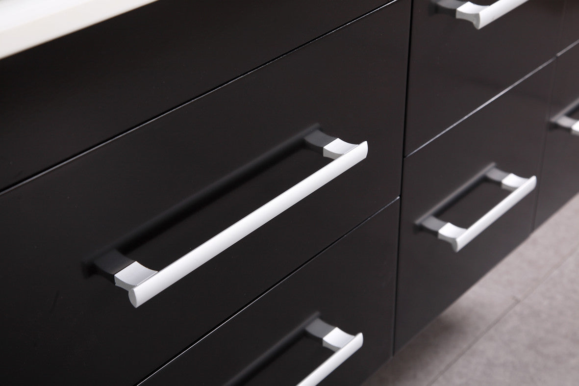 The Springfield 53" Wall mount vanity is constructed of solid oak wood in espresso finish. The designer vessel sink and composite white stone counter top bring a crisp contemporary look to any bathroom. The designer vessel sink and white stone counter top, beautifully contrast with the sharp lines of the espresso cabinetry. This unique vanity includes six drawers and one single-door cabinet adorned with satin nickel finish hardware. The mirror and espresso hanging side cabinet are included. The 55" Springfield wall mount vanity is designed as a center piece to awe-inspire the eye without sacrificing quality, functionality or durability.