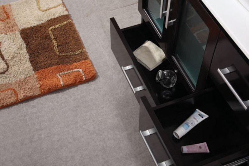 The Stanton 36” Vanity is elegantly constructed of solid oak wood. The white composite stone counter top and rectangular vessel sink design bring a crisp and contemporary look to any bathroom. The designer vessel Sinks soft corners beautifully contrast with the rich features of the espresso cabinetry. This stylish design includes four drawers and soft closing double door cabinet all adorned with satin nickel hardware. Included is an espresso framed mirror. The Stanton Bathroom Vanity is designed as a center piece to awe-inspire the eye without sacrificing quality, functionality or durability.
