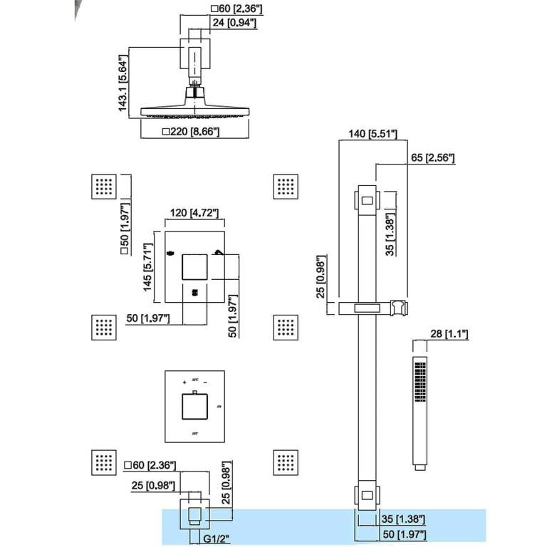 Mz Cubic Modern Bathroom Shower Set W/ Hand Shower & 6 Swivel Jets - Chrome Or Brushed Nickel