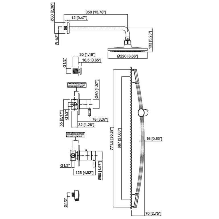 Mz Minima Modern Bathroom Thermostatic Shower Set W/ Hand Shower & 6 Jets - Chrome Or Brushed Nickel