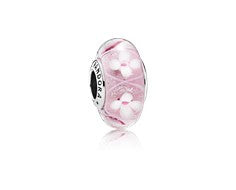 This alluring sterling silver charm features a striking floral pattern within its Murano glass body. Visually stunning, a pink background offsets the delicate white flowers and iridescent glass creates a sparkling water droplet effect.